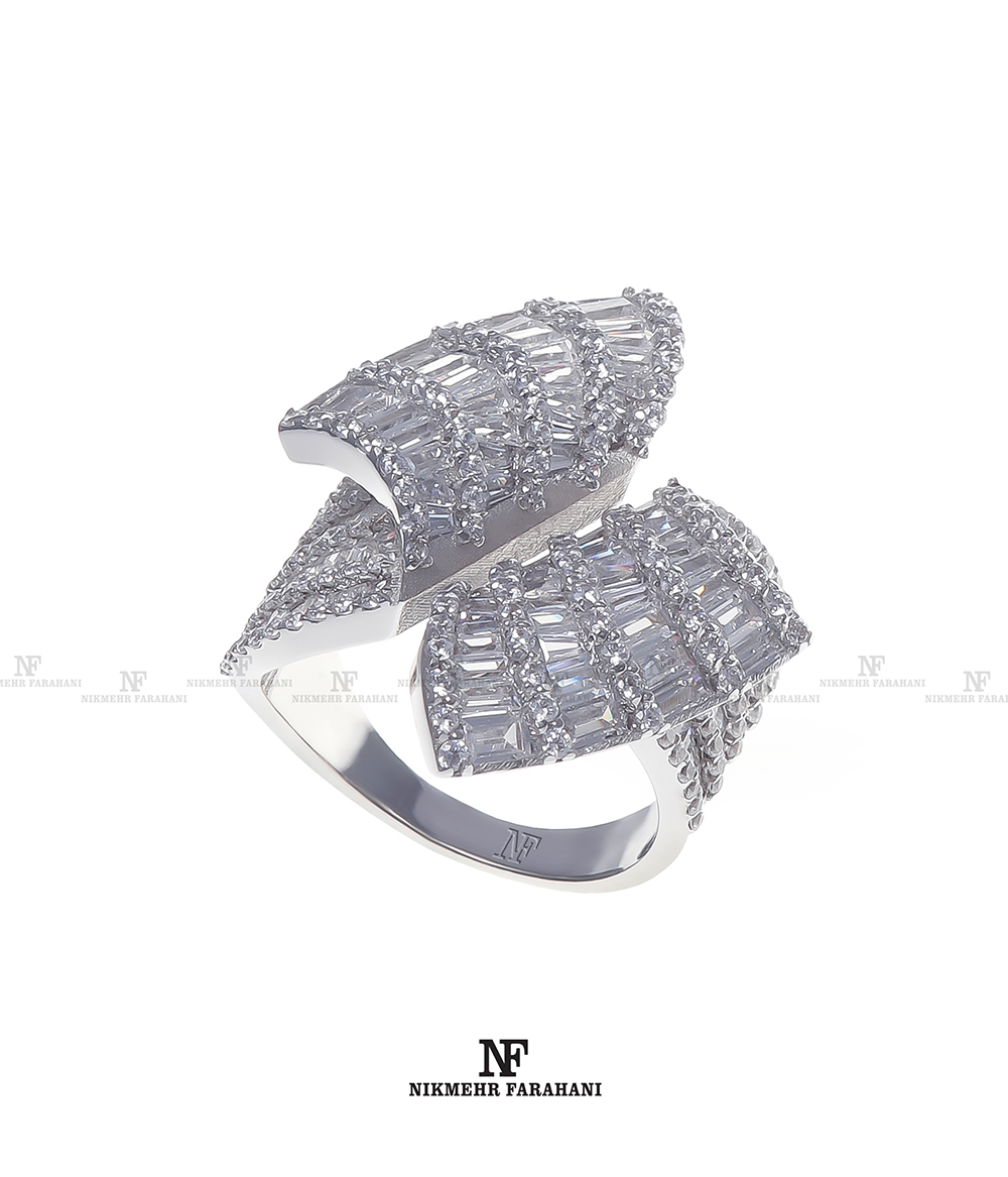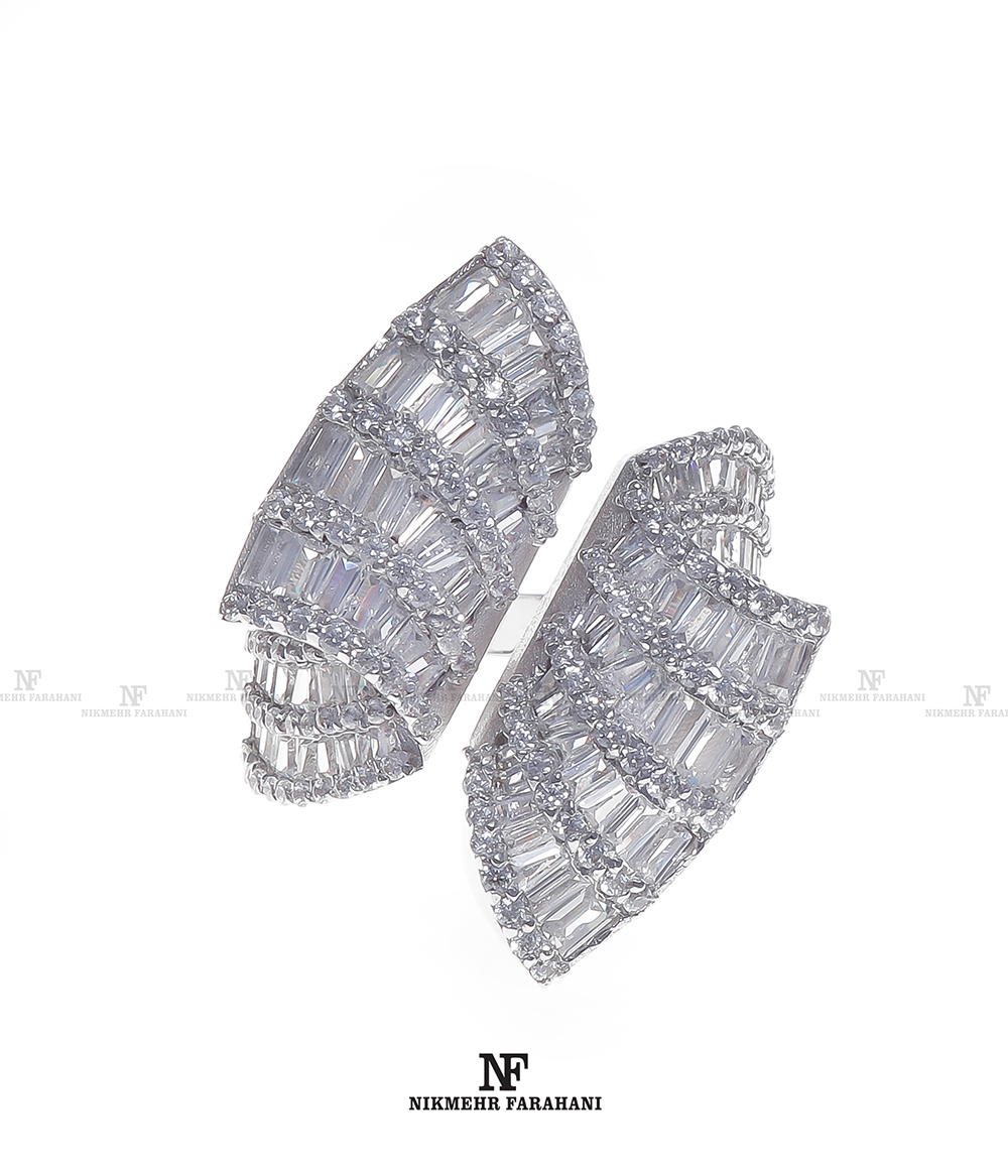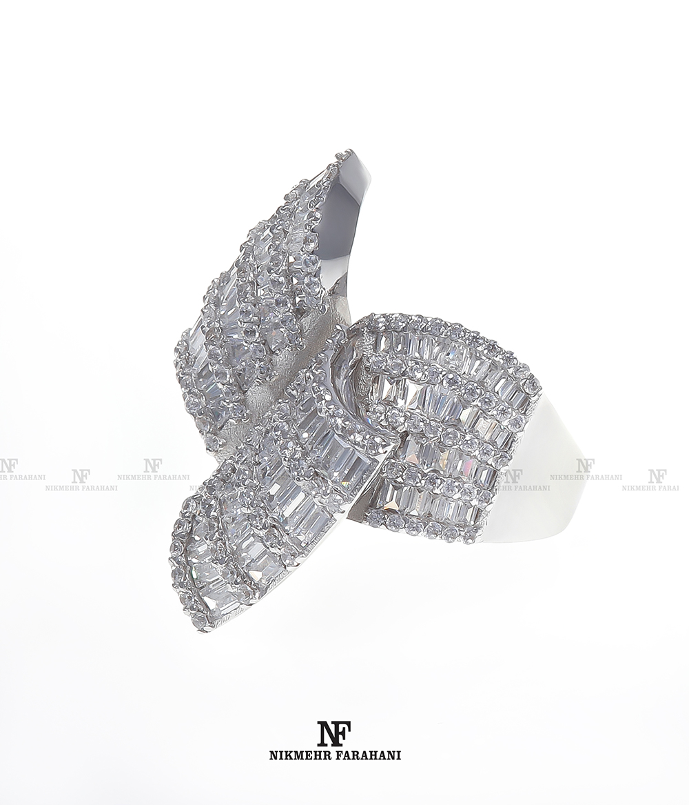 انگشتر زنانه بال پروانه با پایه جواهر مزین به نگین های زیرکنیوم آمریکایی شناسنامه دار با تراش باگت و گرد