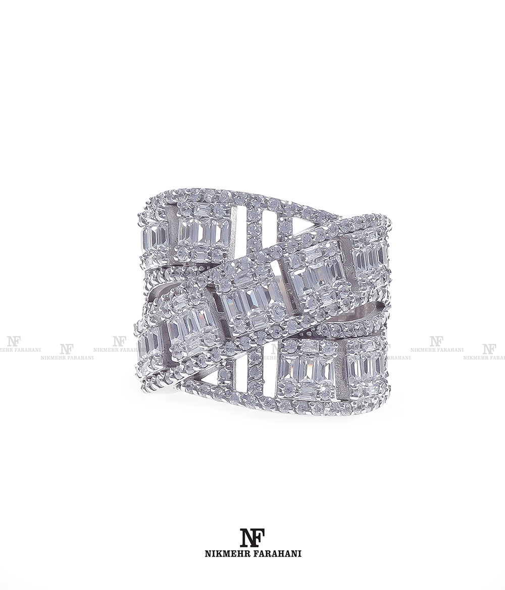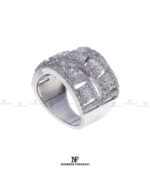 انگشتر زنانه با پایه کارجواهر مزین به نگین های زیرکنیوم آمریکایی شناسنامه دار با تراش باگت و گرد