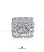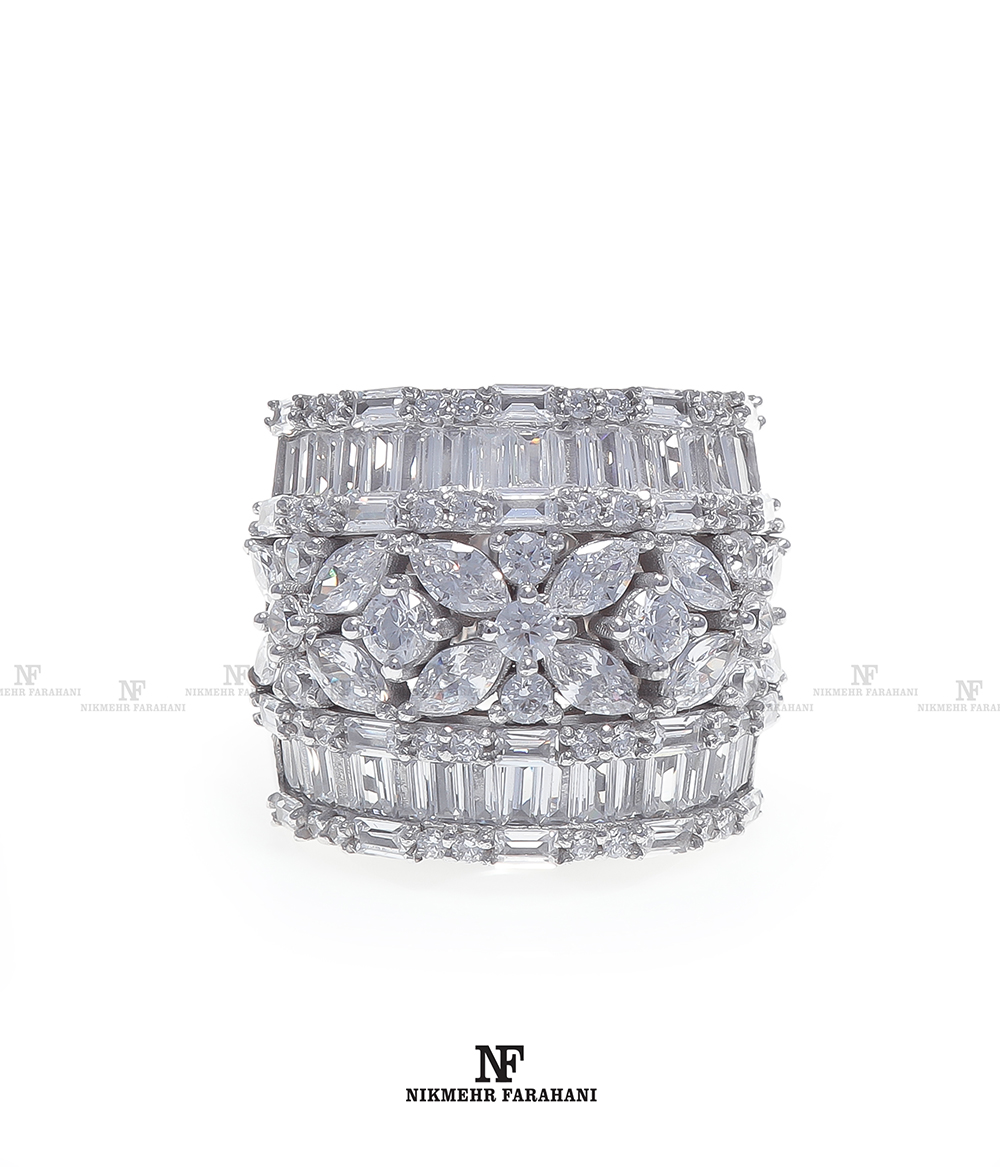 انگشتر زنانه پایه جواهر مزین به نگین های زیرکنیوم آمریکایی شناسنامه دار با تراش مارکیز و باگت