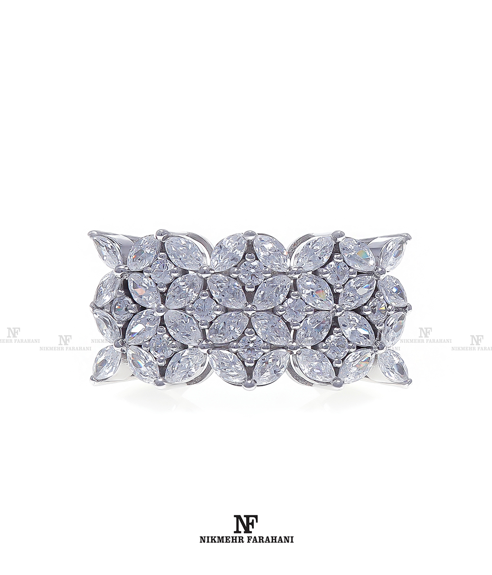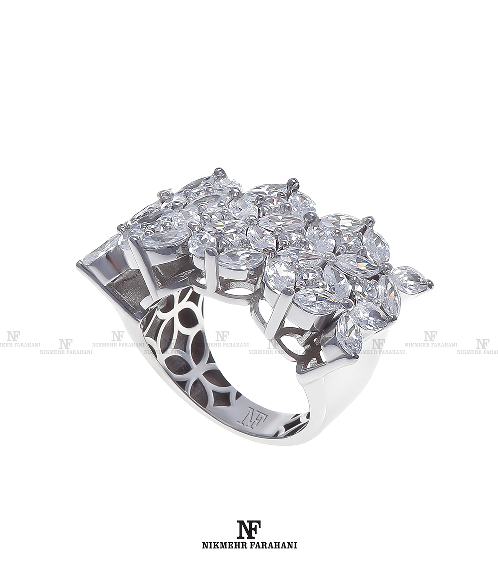 انگشتر زنانه ژورنالی با پایه جواهر مزین به نگین های زیرکنیوم آمریکایی شناسنامه دار