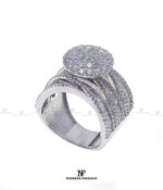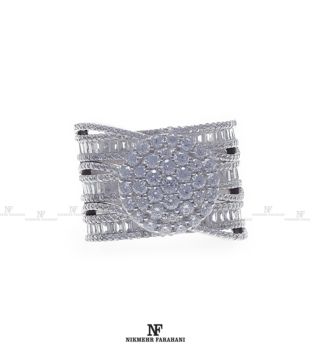 انگشتر زنانه با پایه جواهر مزین به نگین های زیرکنیوم آمریکایی شناسنامه دار با تراش باگت و گرد